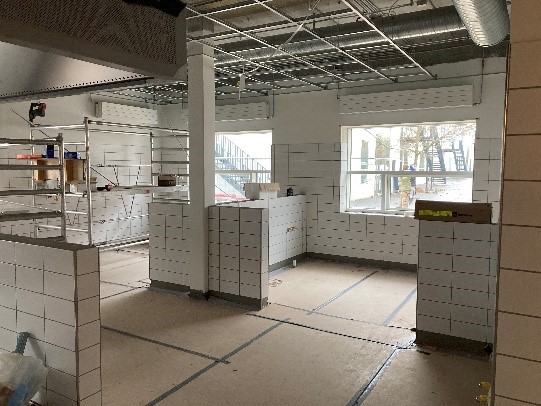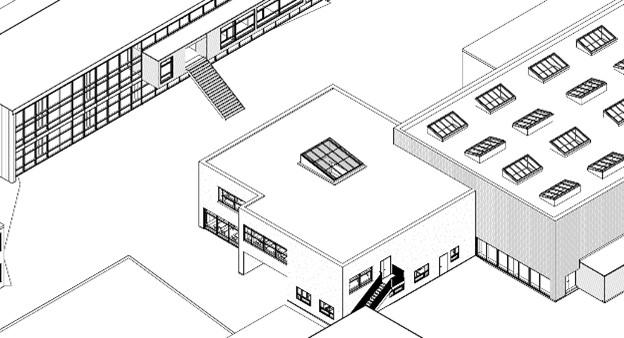 Faciliteter til madskole sikres ved ny tilbygning i 2 plan, indeholdende spiseområde, produktionskøkken, fryse- og kølerum, toiletforhold, elevator og teknikrum.
